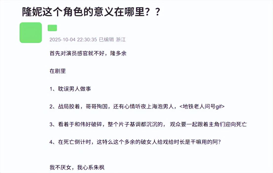 可惜,她的演技和吴越压根没法比,甚至还有观众发出灵魂质问,搞不明白这个角色的意义究竟在哪里。